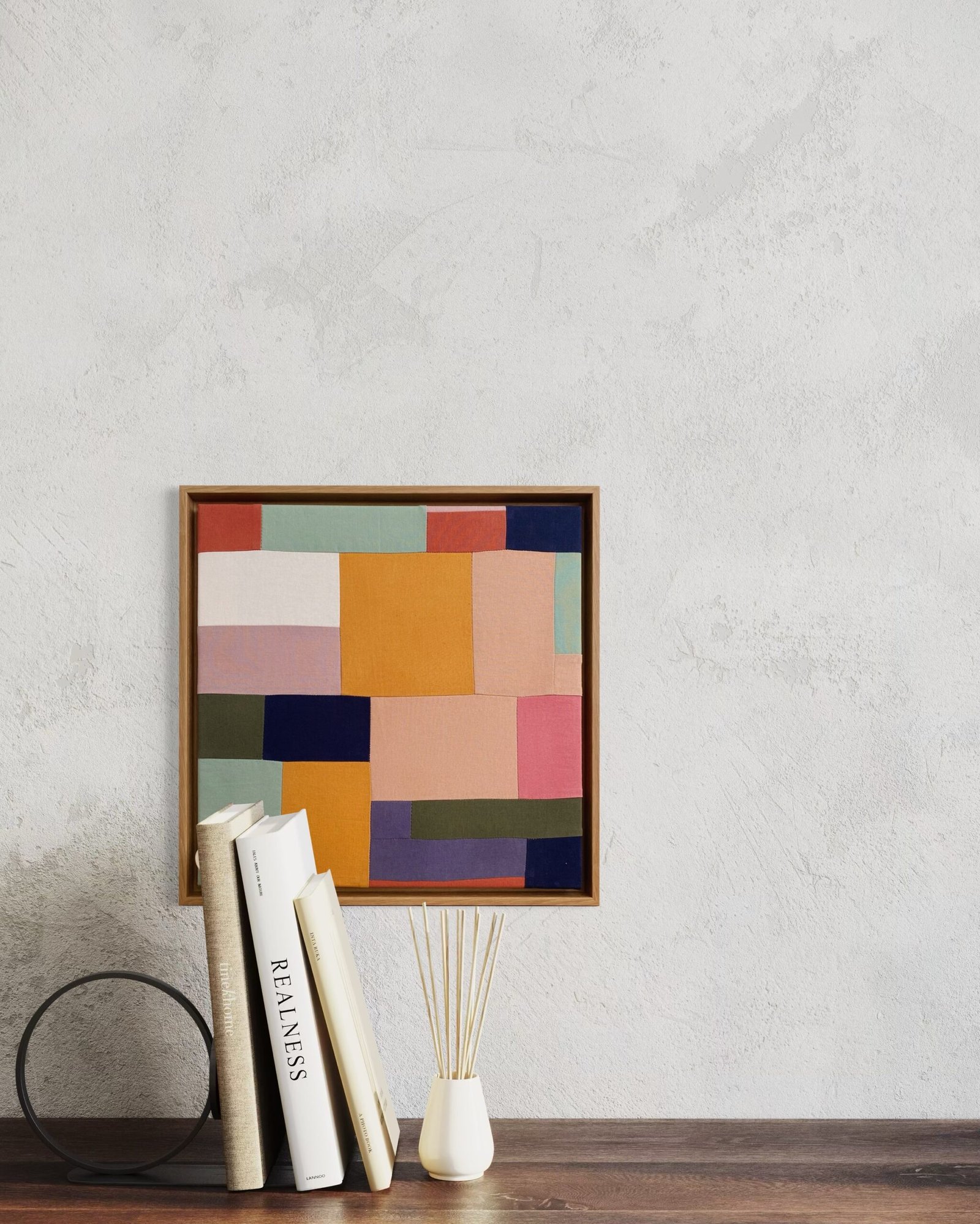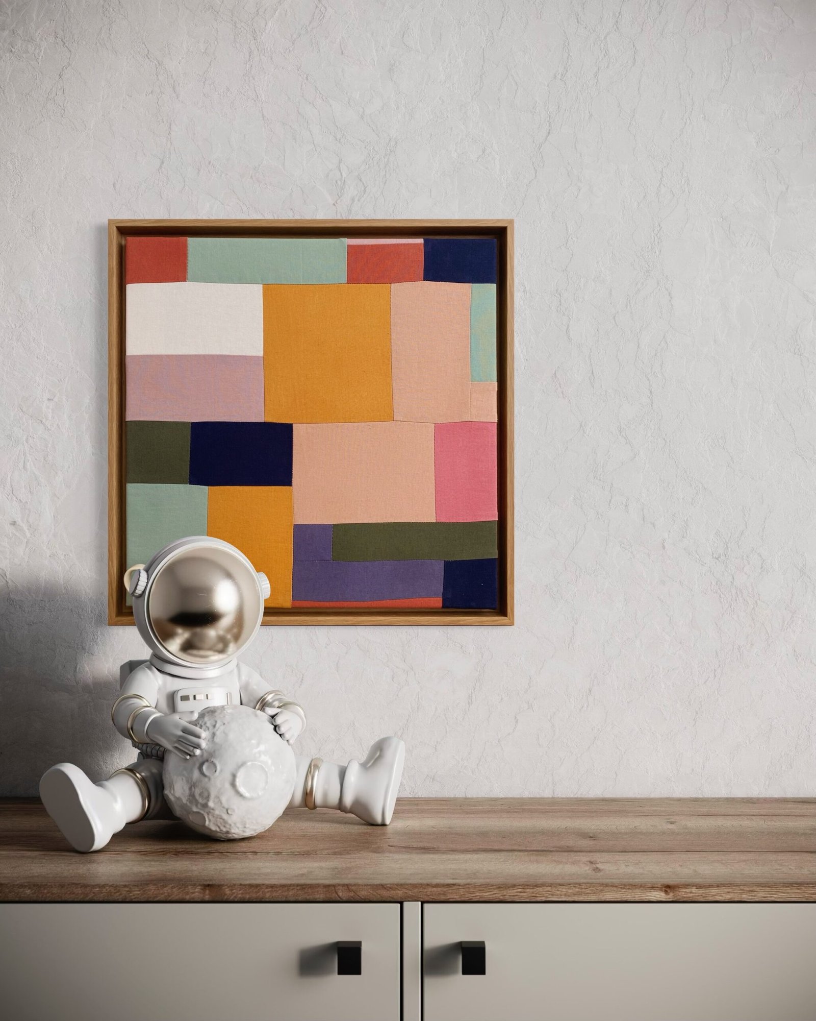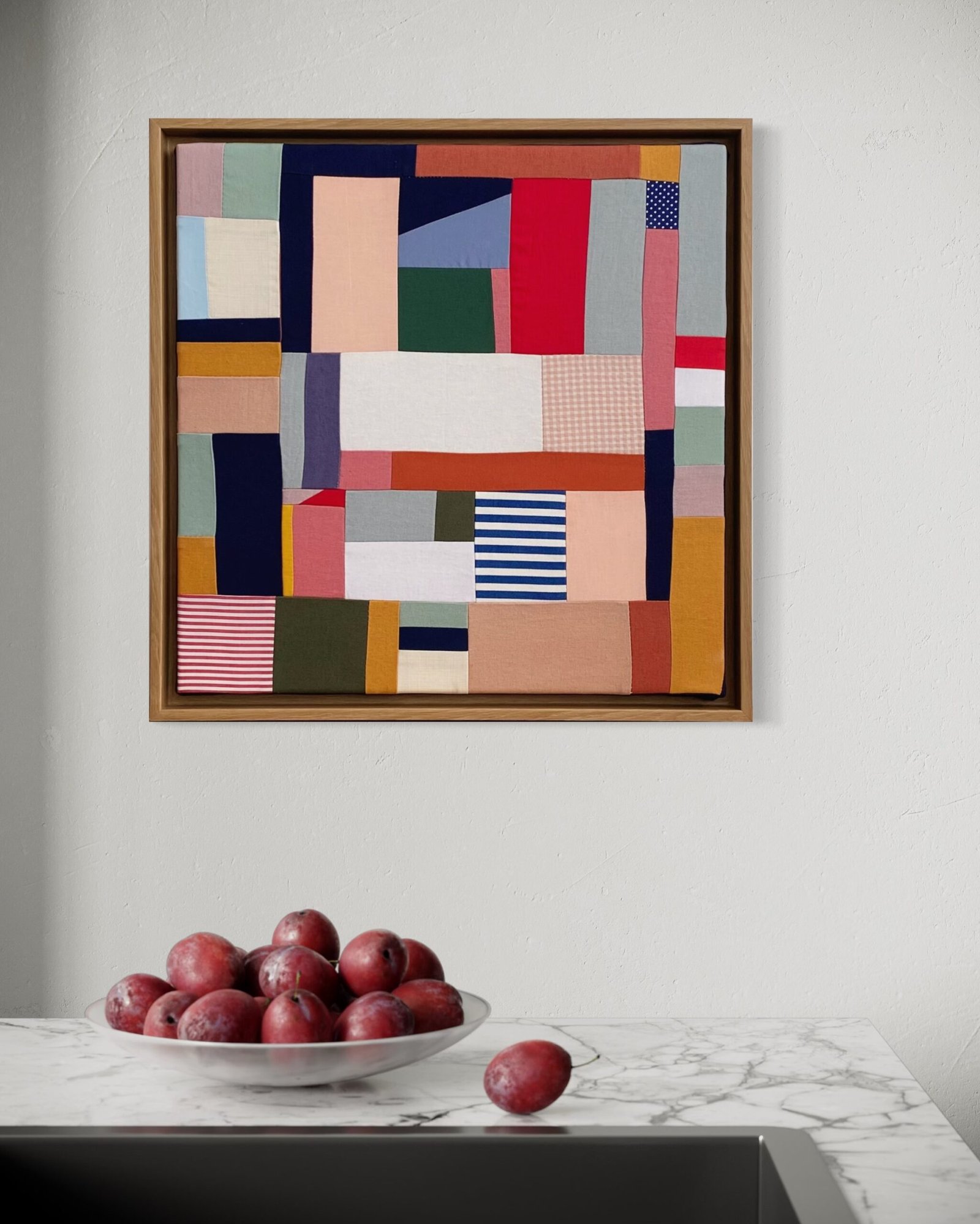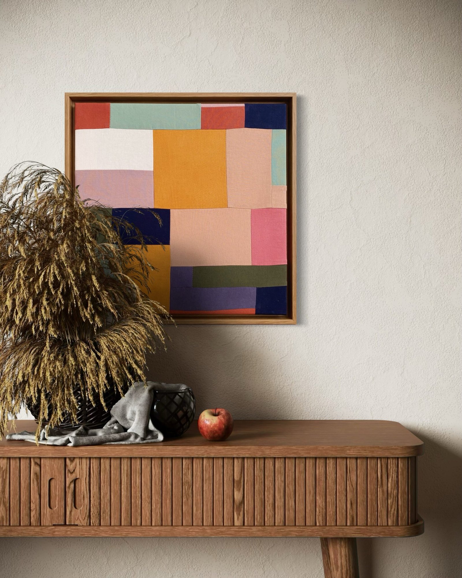 Patchwork de algodón, lino y retales sobre bastidor de madera. Enmarcado en roble.