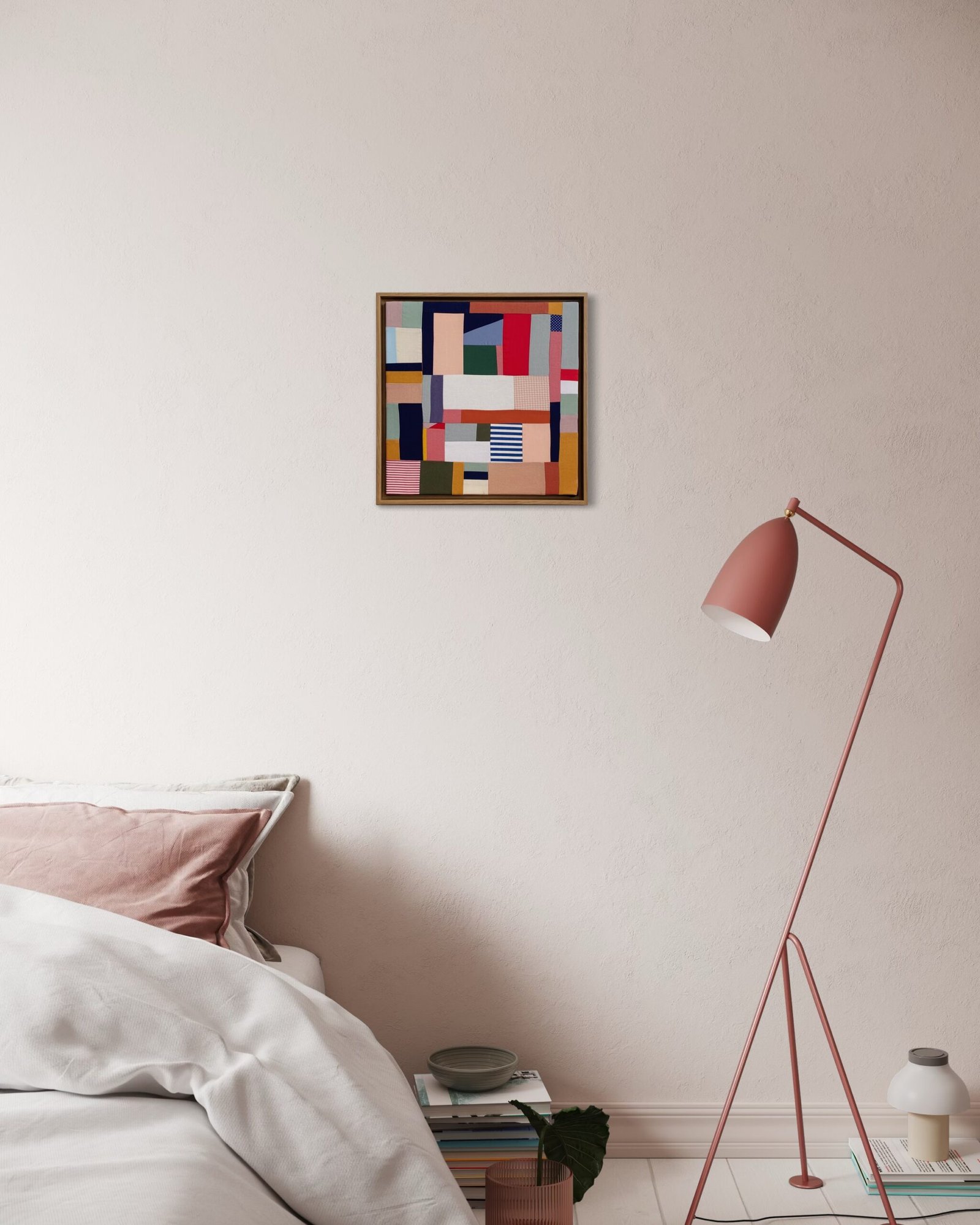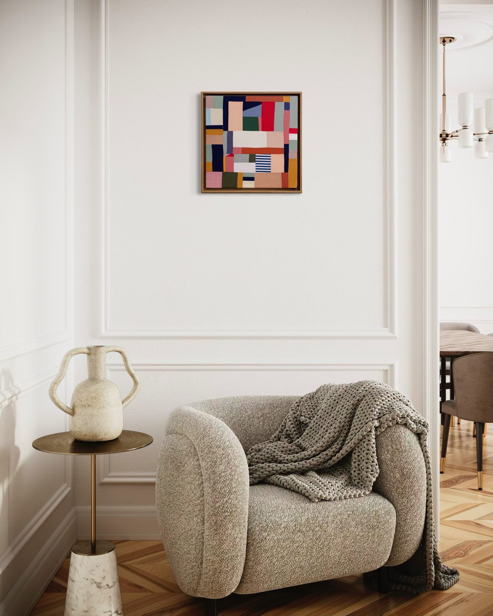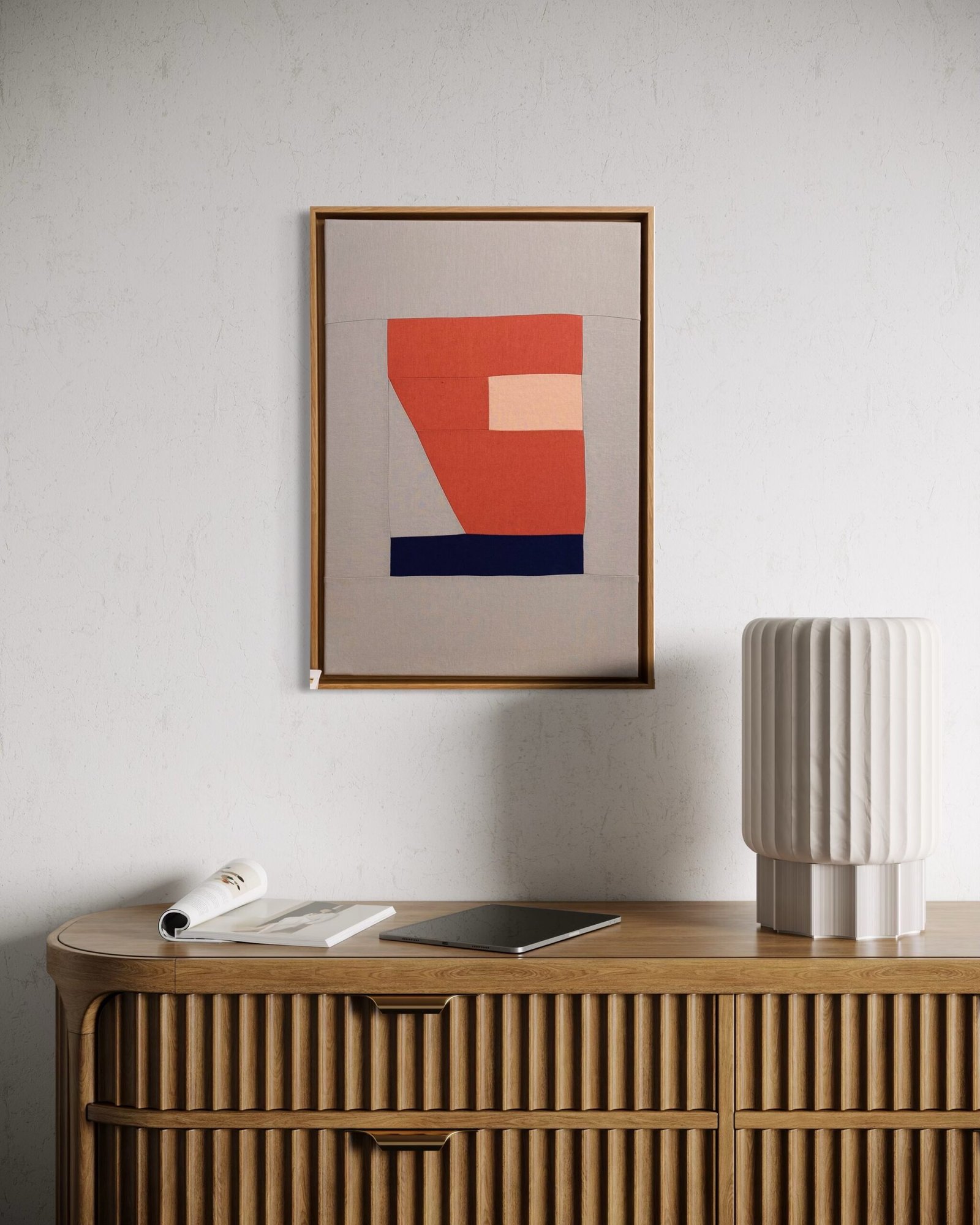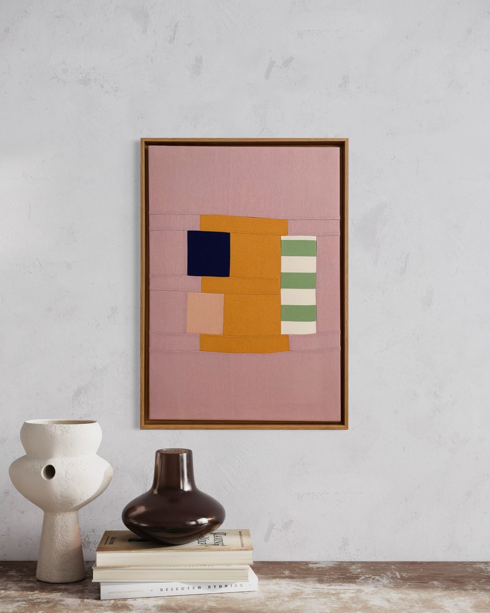 Patchwork de algodón, lino y retales sobre bastidor de madera. Enmarcado en roble.