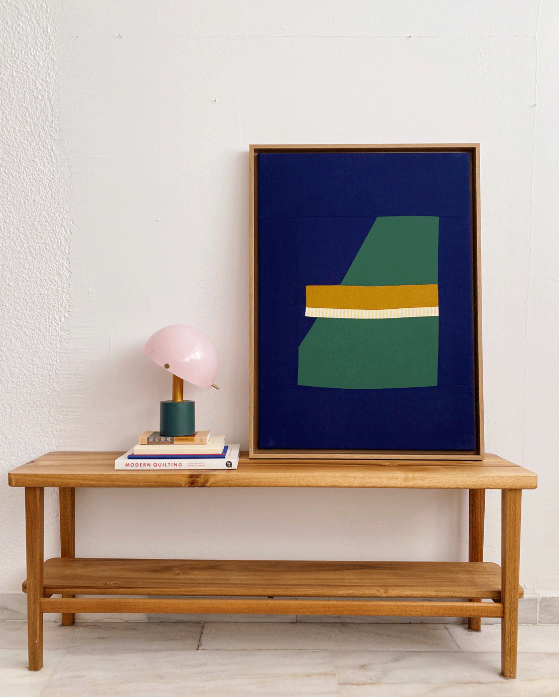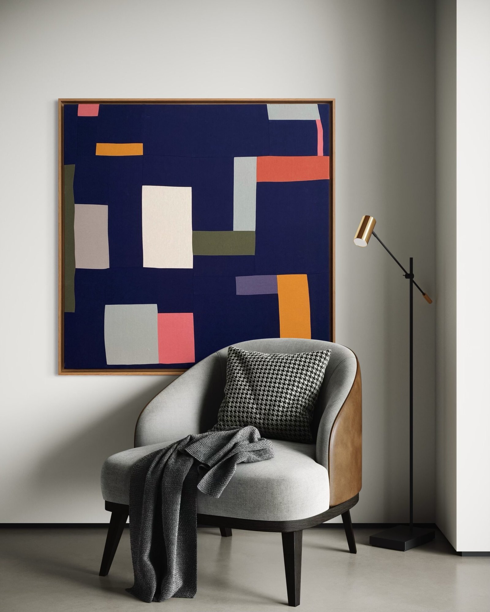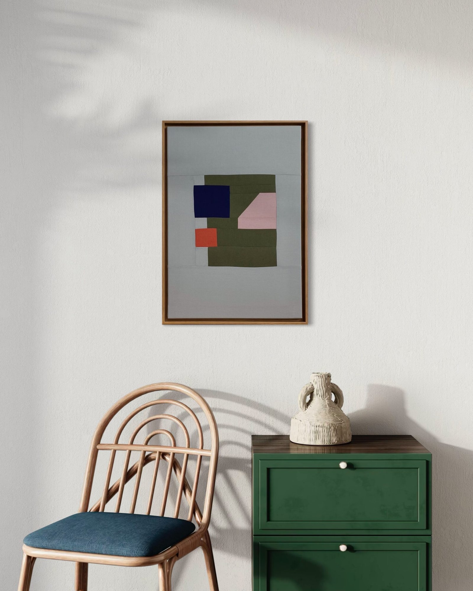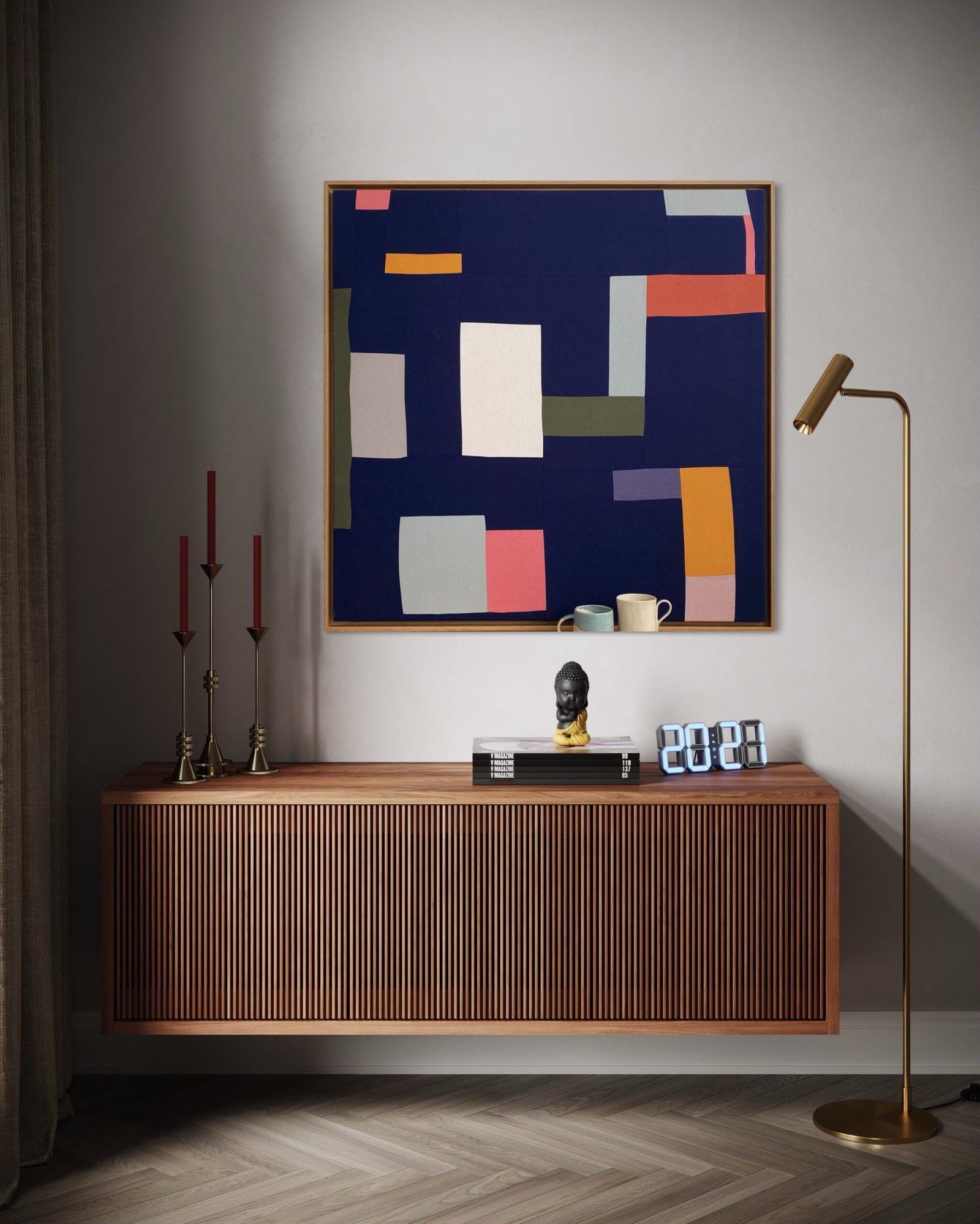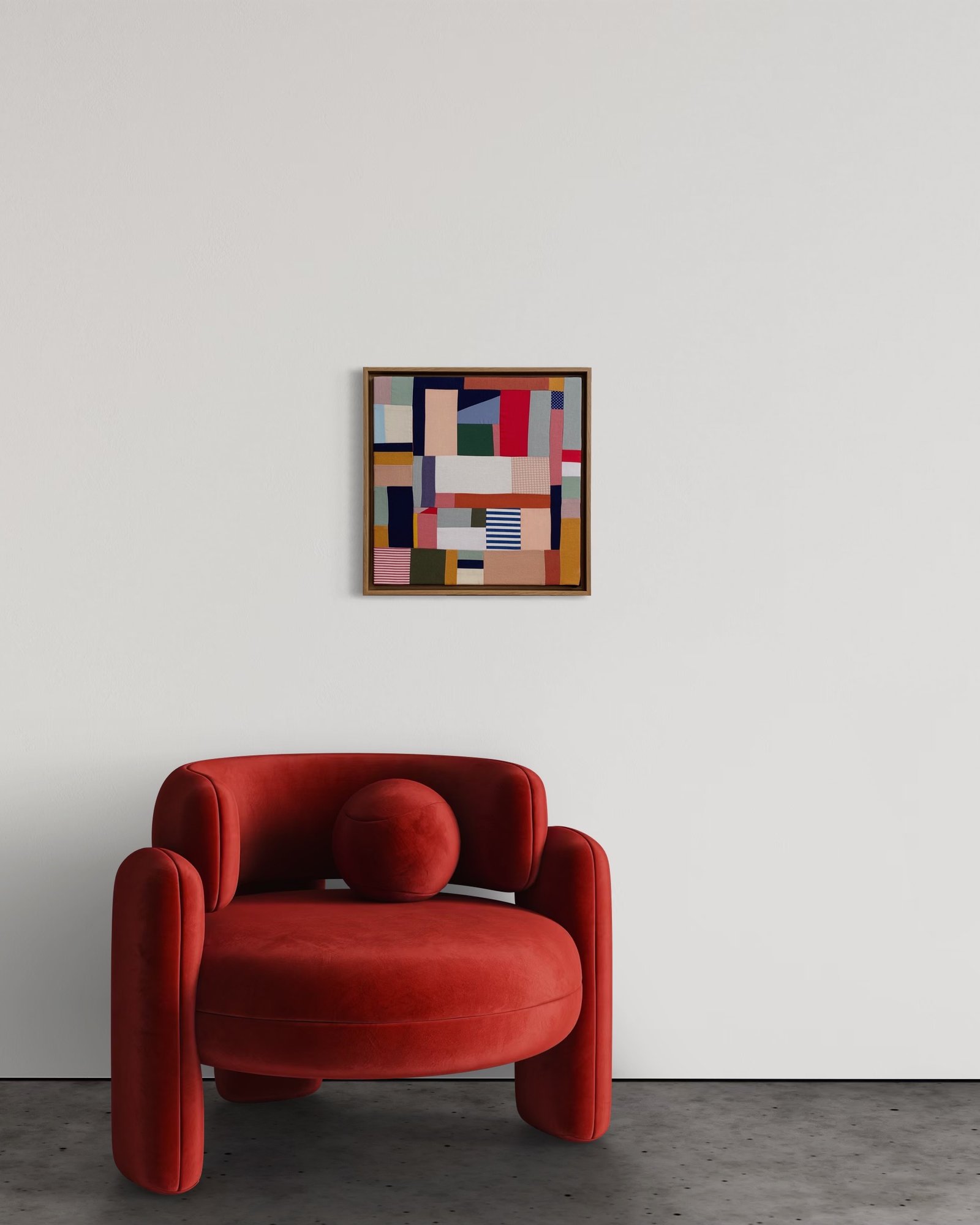 Patchwork de algodón, lino y retales sobre bastidor de madera. Enmarcado en roble.