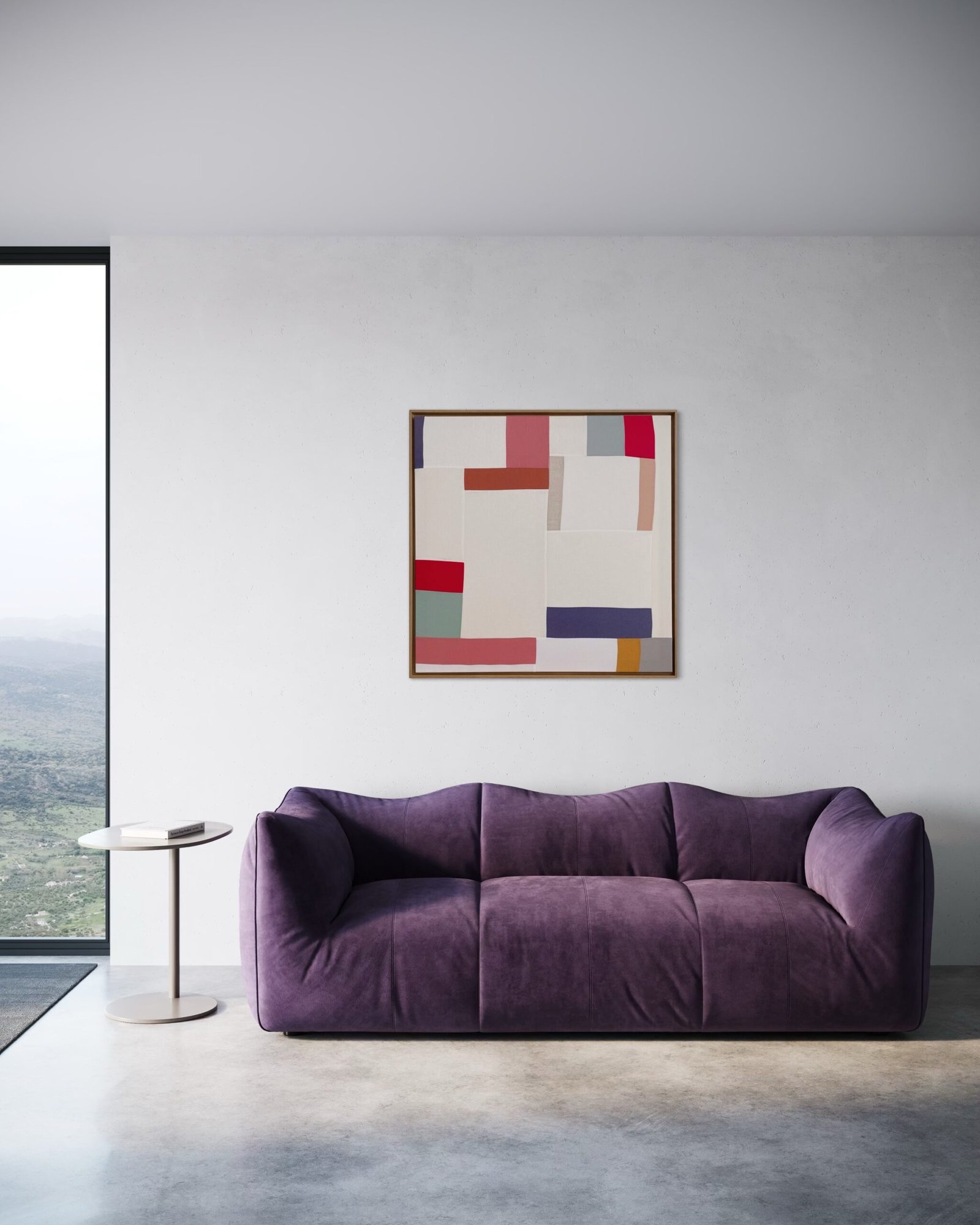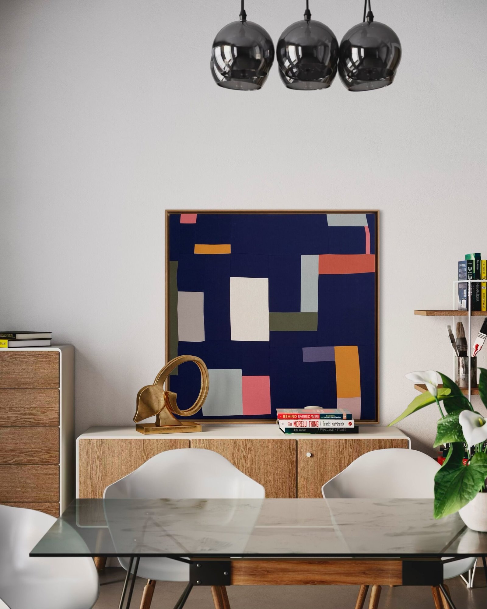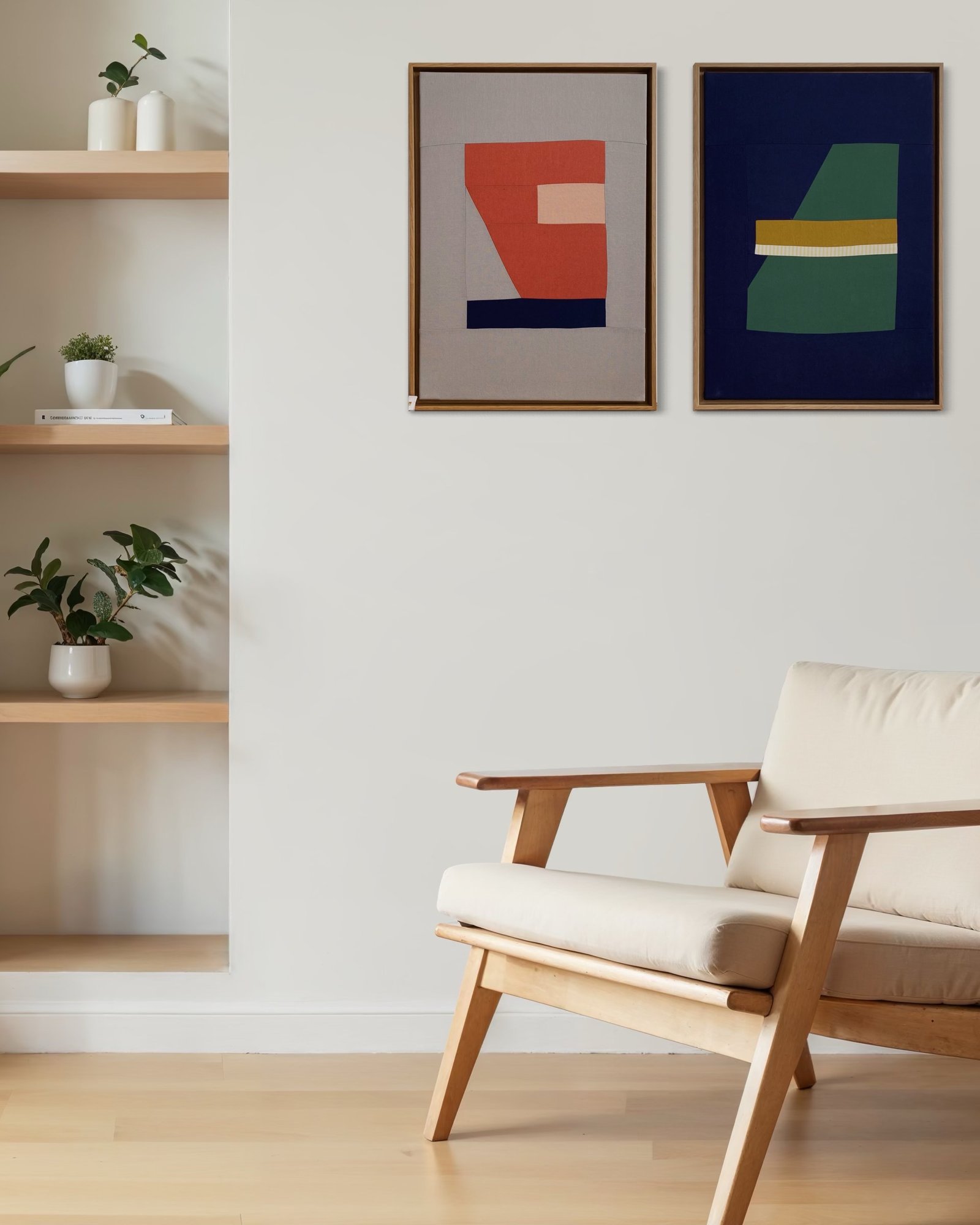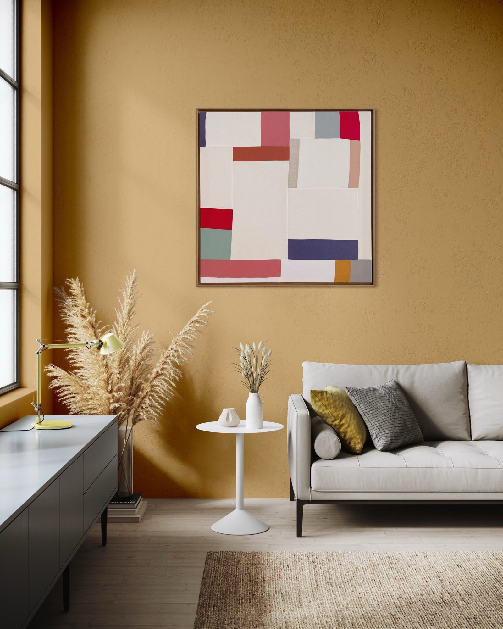 Patchwork de algodón, lino y retales sobre bastidor de madera. Enmarcado en roble.