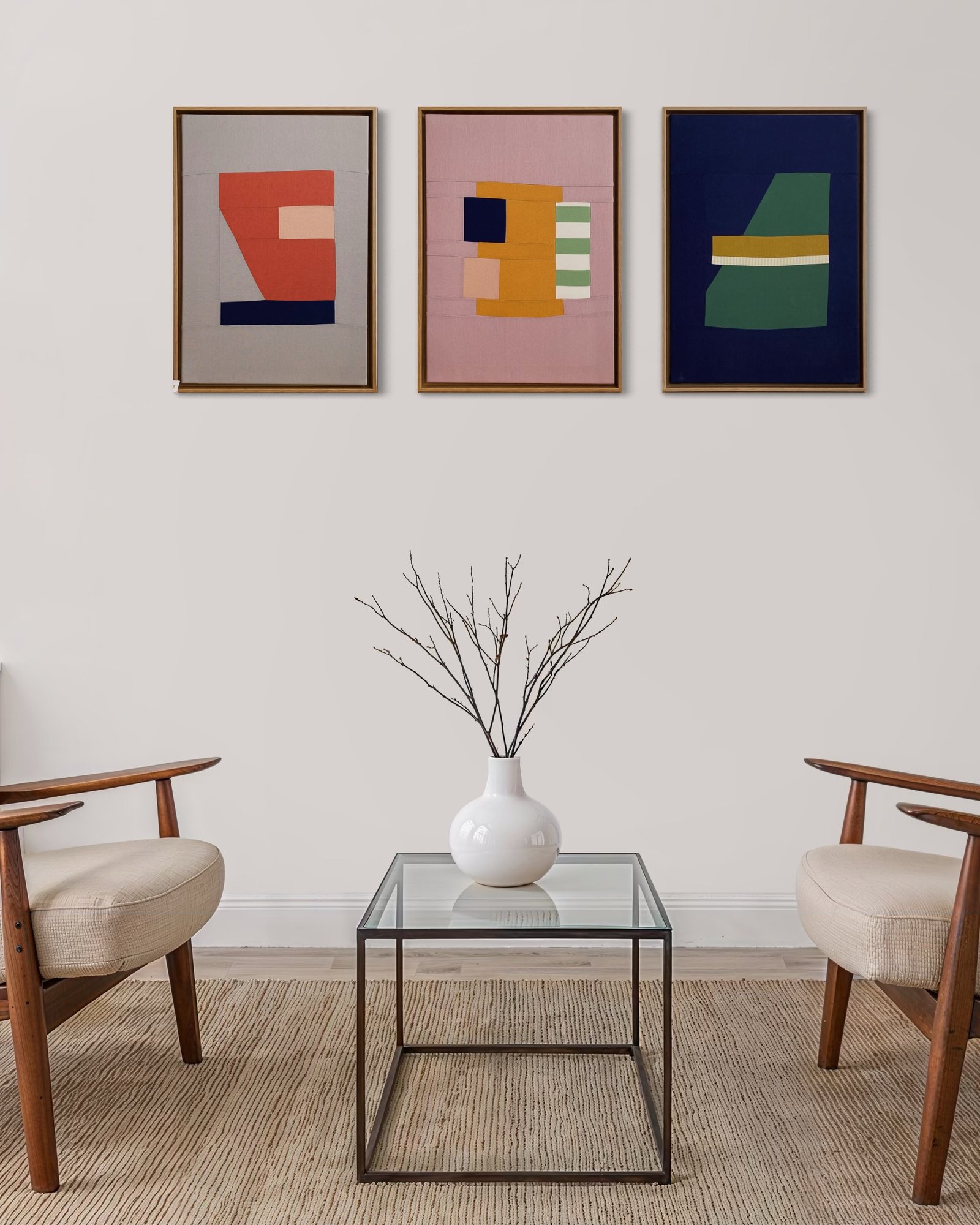 Hechas con tejido mezcla de hilo y algodón y algunos retales sin origen claro, son obras de colores sutiles, llenas de sorpresas a la vuelta de la esquina.