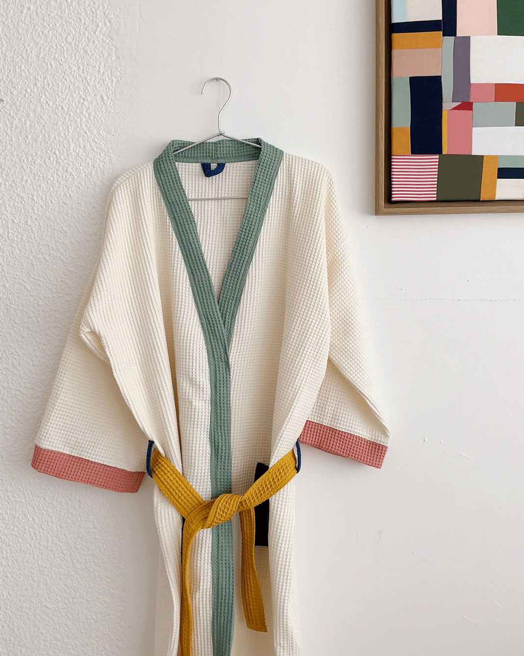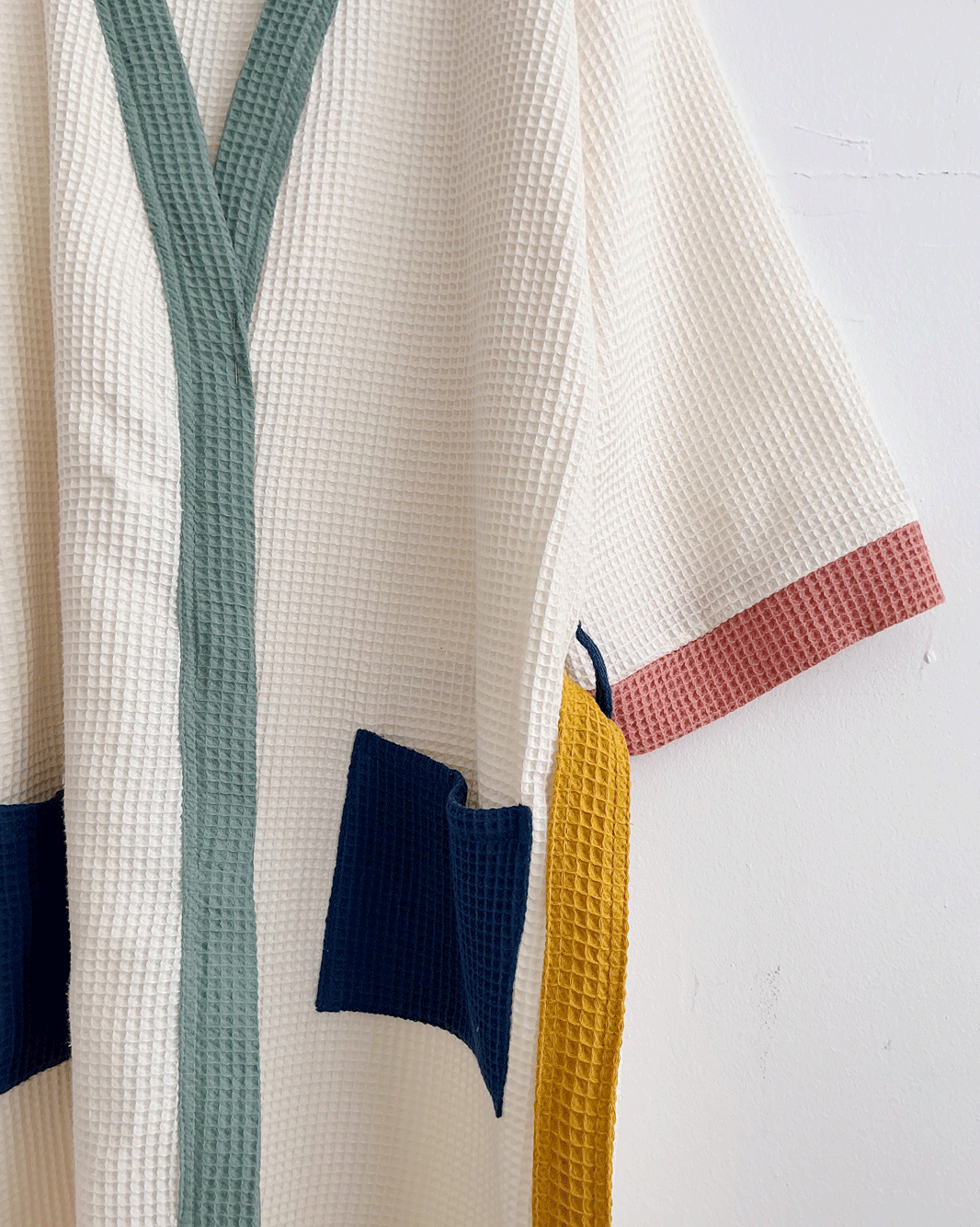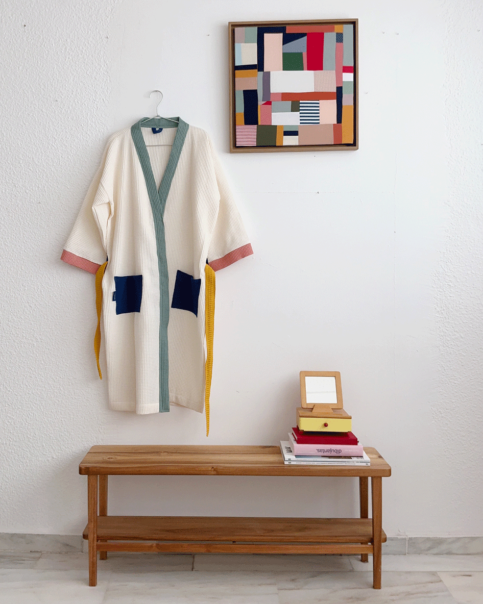 Hemos aprovechado los últimos retales de tejido para hacer una pequeña tirada de albornoces pero waste: El espíritu de Hamabi siempre viene del patchwork y jugar con colores, así que la mejor manera de usarlos era diseñar nuevos modelos aprovechando todos los tejidos. Están llenos de contrastes y piezas coloridas que los hacen únicos 🌈