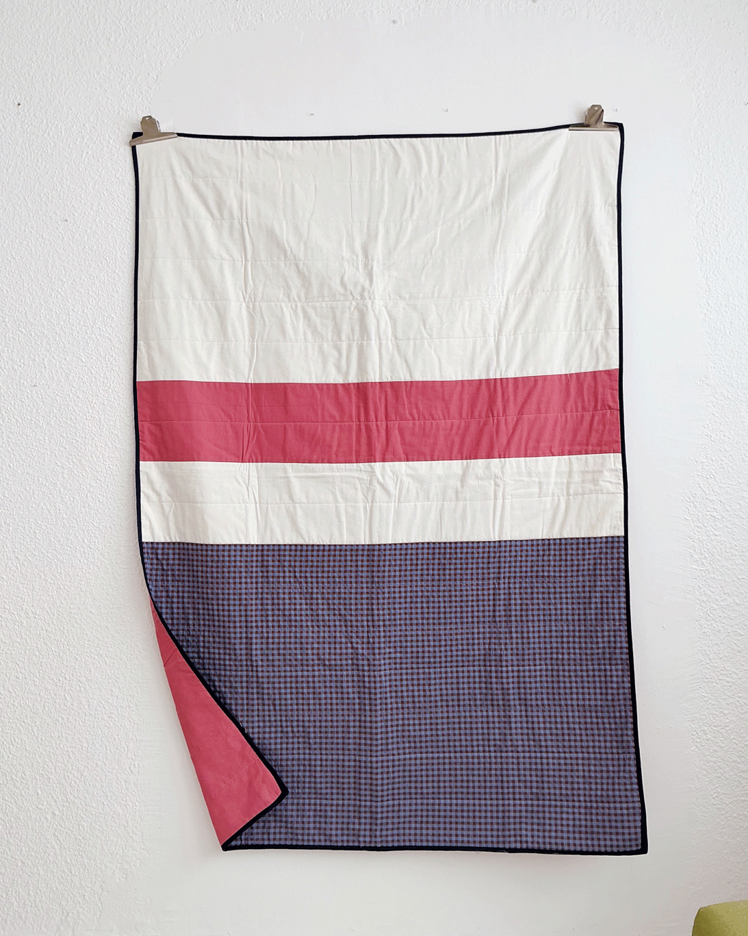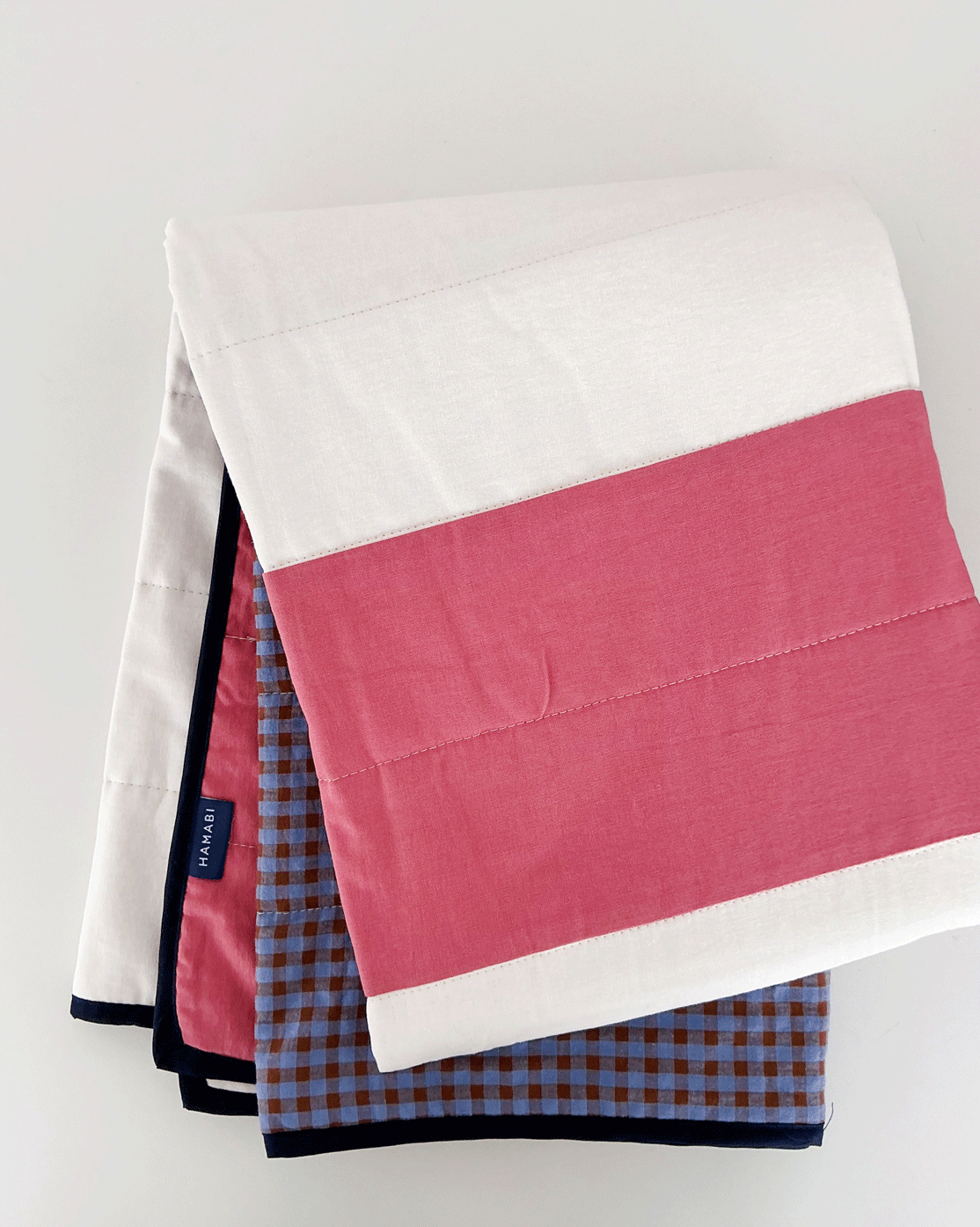 🟨 Diseño: Minimalismo puro. Un fondo blanco roto cruzado por una banda de color rosa fucsia. Debajo, una gran pieza de tejido vichy con algo de textura en colores suaves y delicados.