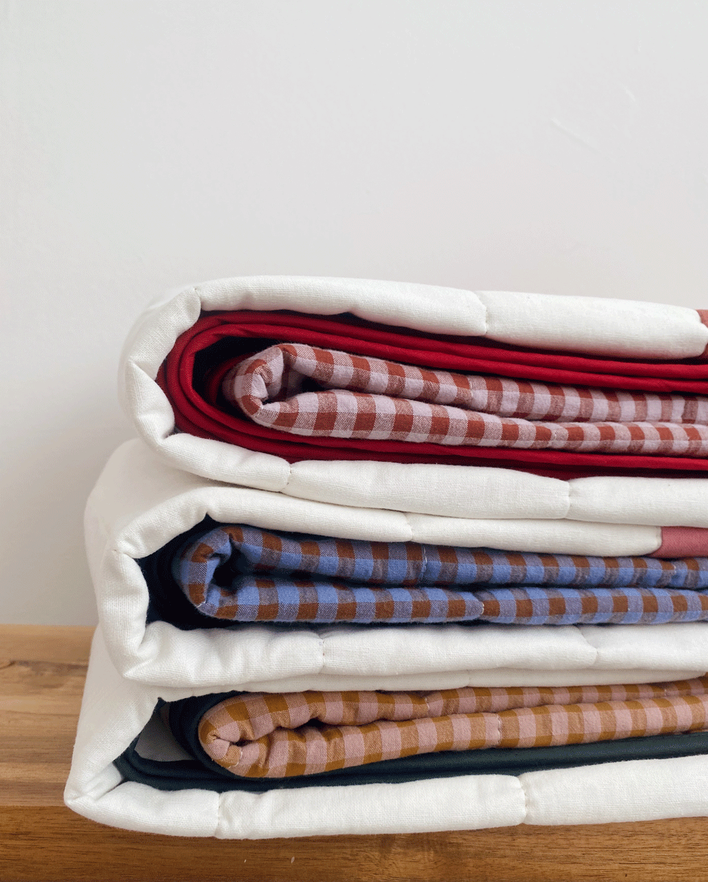 🧶 Calidad: Confeccionado en tres capas de tejido: Arriba y abajo el tejido es una mezcla de algodón y lino. Es un tejido con peso, gustoso, con textura y muy agradable. Se irá suavizando con el uso y los lavados. El tejido vichy es de algodón con algo de relieve.En medio lleva una guata ligera pero muy cálida, mezcla de algodón y bambú.