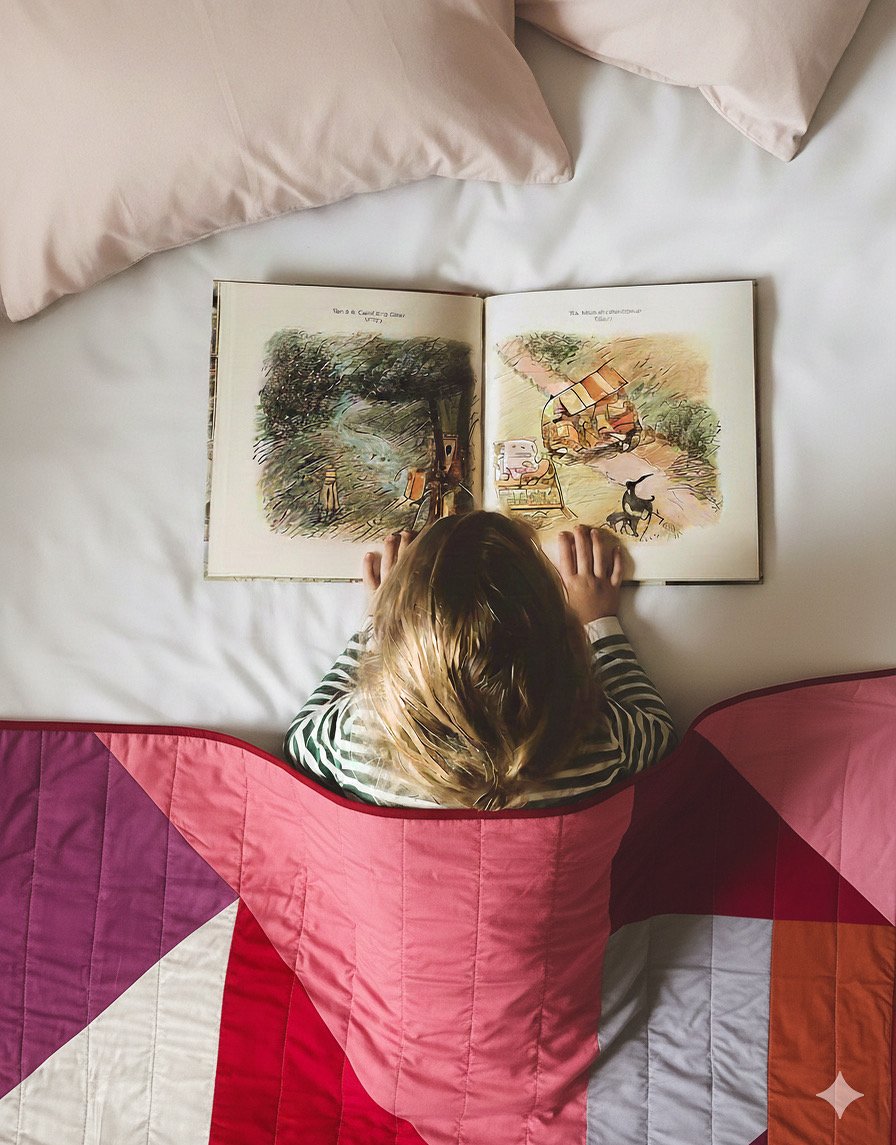 En colores discretos pero alegres, perfectos para una cama individual que crece desde bebé a adolescente o para un apartamento de playa donde a veces refresca.